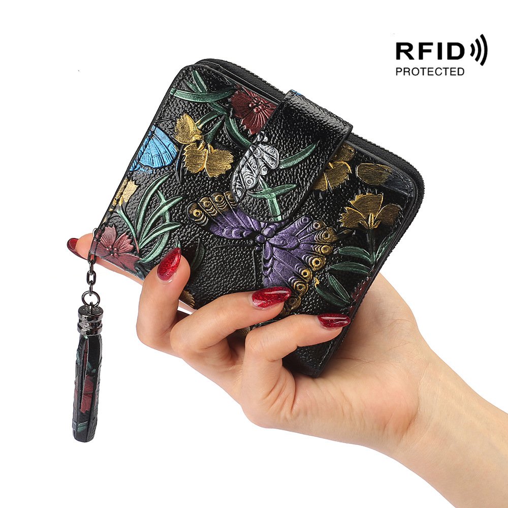 【ミニ花柄財布】本革 立体感のあるローズ柄 多機能 大容量 チャック+スナップボタン 軽くて便利